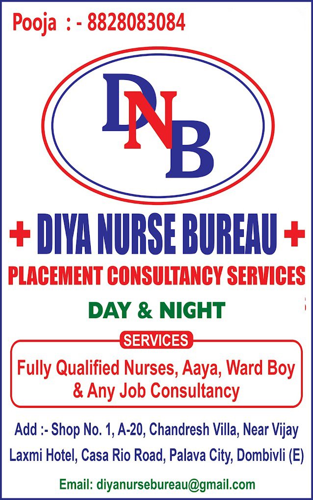 The Diya Nurse Bureau in Dombivli, Mumbai, and Navi Mumbai, Thane, offer "pay" services like COVID, post-COVID, age-related paralysis, local helpers, nannies, wordboys, caretakers, and nurses for conditions like Alzheimer's and dementia, as well as nursing and full-time care, to patients and senior citizens in their homes and hospitals eight, twelve, and twenty-four hours a day.